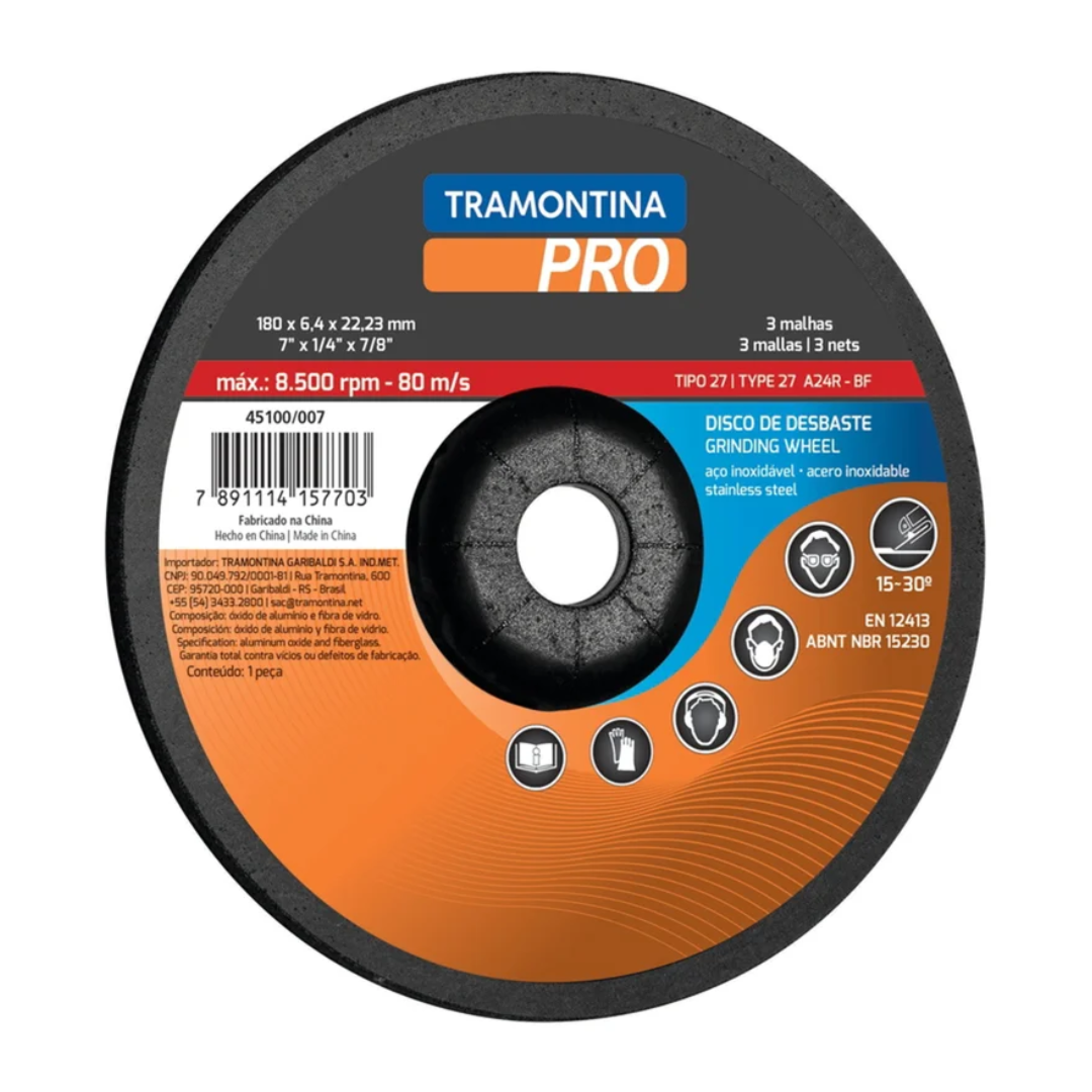 Disco de desbaste 4.1/2″ TRAMONTINA PRO, utilizado juntamente con esmeriladoras (amoladoras) en trabajos de desbaste específicamente en aceros inoxidables (Inox). Proporciona un excelente rendimiento en las operaciones de desbaste.