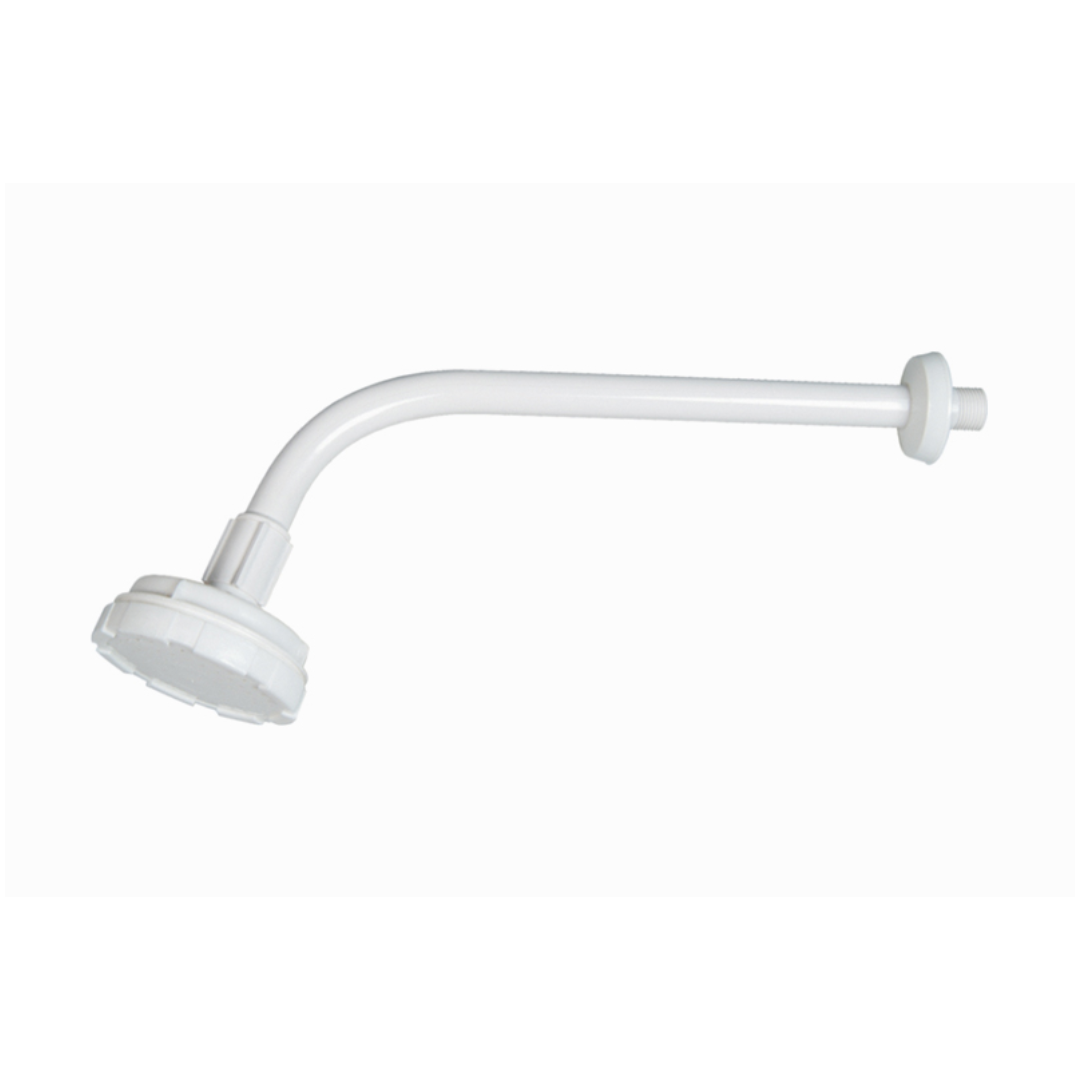 Ducha para piscina de pared, formato redondo. Fabricada en plástico ABS color blanco. Caudal de 8 L/min con chorro fijo. Incluye brazo de ducha y canopla (embellecedor).