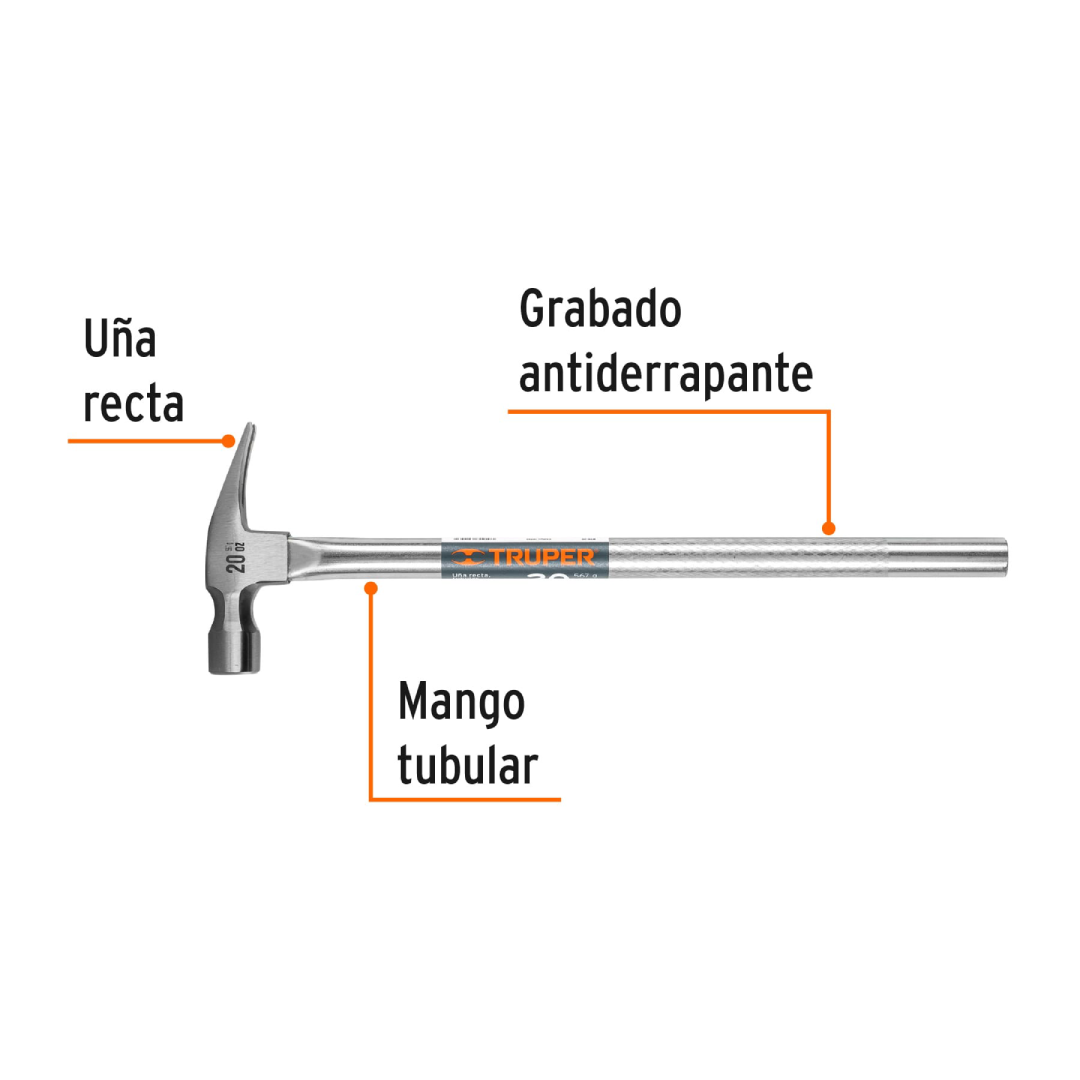 Martillo de uña recta con cabeza de 20 oz y mango tubular, marca Truper. Diseñado para trabajo pesado.