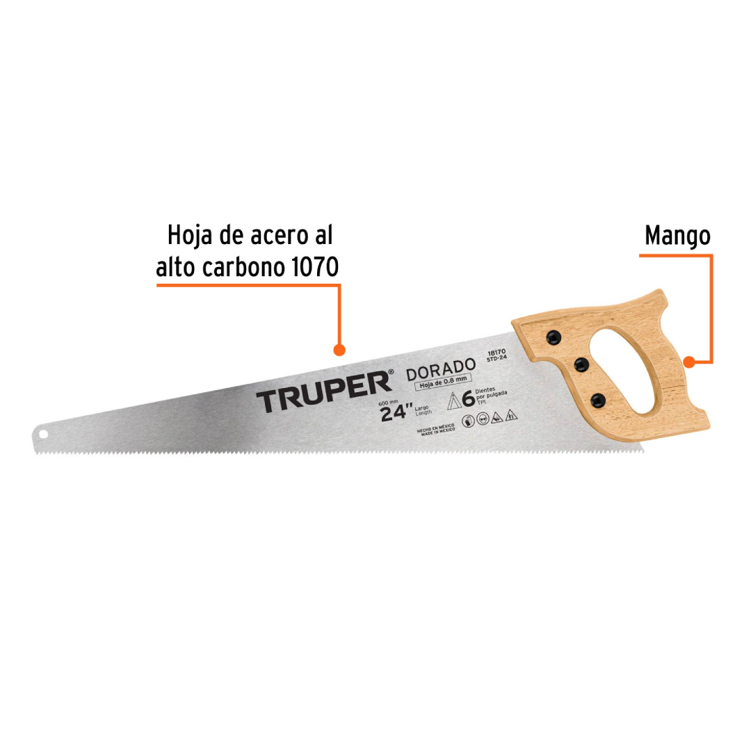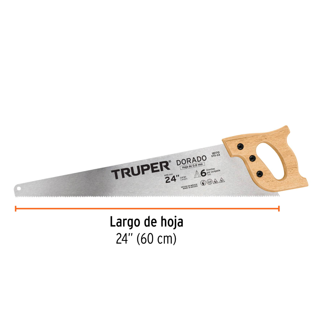 Serrucho de carpintería de 24 pulgadas, modelo Dorado, marca Truper. Diseñado para cortar madera seca, ya sea delgada o gruesa, dura o suave.